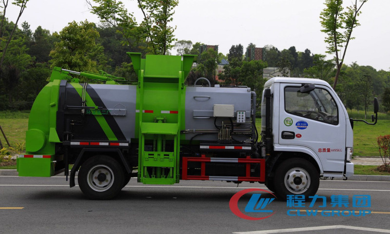 方形罐體廂式餐廚垃圾車是市面上最新一代的餐廚垃圾車類型,具有造型美觀,功能齊全的優點。主要有四種型號,微型(3方)、小型(6方)、中型(8方)、大型(9.5方),箱體采用4~6mm優質Q345碳鋼板制作(也可選用不銹鋼制作),其主要構成包括底盤部分,后門、垃圾箱、側提桶機構、推鏟、電控系統、液壓系統、清洗系統等。合理的結構設計保證產品的性能優化,垃圾箱頂部和側面曲面設計整體提高框架剛度的同時增加產品美觀性;垃圾箱前端設計有清水箱,方便產品清洗;餐廚垃圾車排放液體垃圾可通過管道排放,排放固體垃圾根據不同需求有標準型后門和加裝型后門兩種配置,其中標準型后門可與推鏟結合,后門打開后通過推鏟實現垃圾的推擠排料,加裝型后門設有螺旋機構,除可實現推擠排料外,通過螺旋機反轉和推鏟逐步推出實現密封排料,降低因餐廚垃圾飛濺而造成的二次污染。