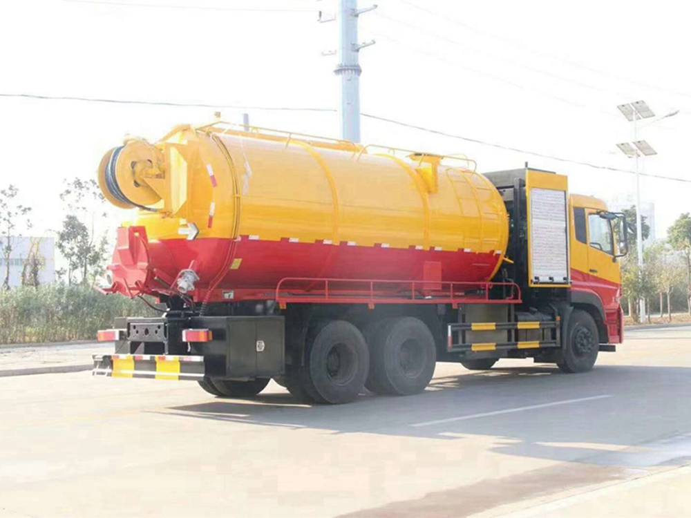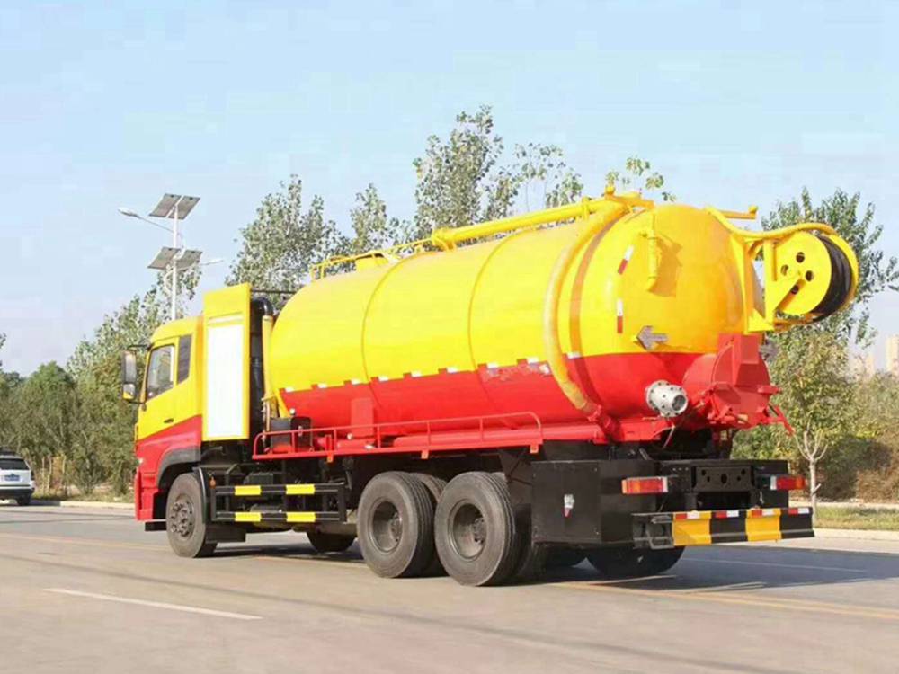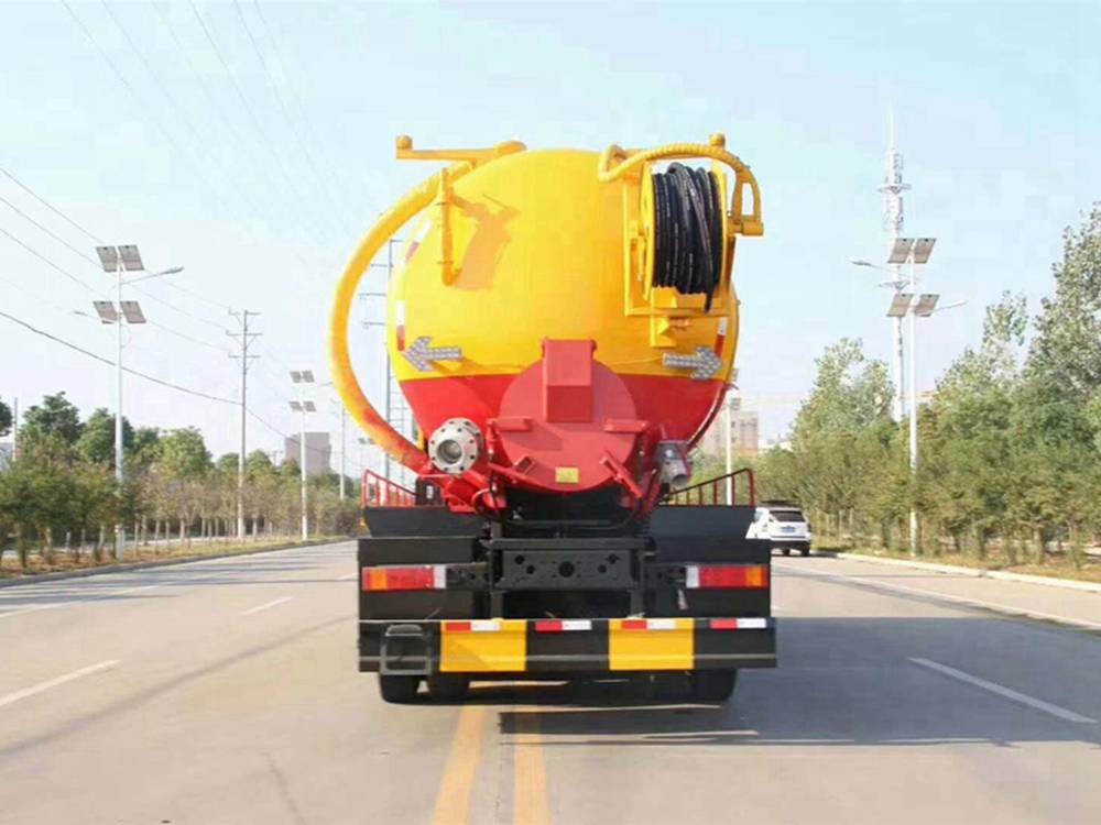 清洗裝置:配天津通潔300升高壓泵, 60米PVC雙層高壓管22通徑高壓管,10個高壓噴頭,兩個水泥蓋,頂部100的互通,水污互通用100的球閥,水罐3寸球閥安在罐體最底部.水倉污倉罐體內(nèi)噴防銹,后封頭600的液壓口,一個6寸自流,一個4寸的進料口,一個4寸的排污口,側面一個6寸的球閥偷排。后蓋加裝活動可拆式卷盤壹套,右后側一套卷盤,罐體采用8個厚鋼板制作,后蓋上帶一個600液壓口排污,300側邊自流口。