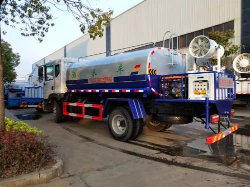 罐體容積:5立方,罐體采用機器壓板一次性成型技術,罐體加厚至4mm,采用先進旋邊機,罐體包罐機工藝保證了罐體制作的精度和美觀。全國獨有烤漆工藝,防腐除銹,多層底漆、面漆噴涂。 功能齊全,配備前沖、后灑、側噴、綠化高炮,采用優質水泵,合理設計水路管道,氣控取力器,作業能力強,提高了車輛的使用效率。