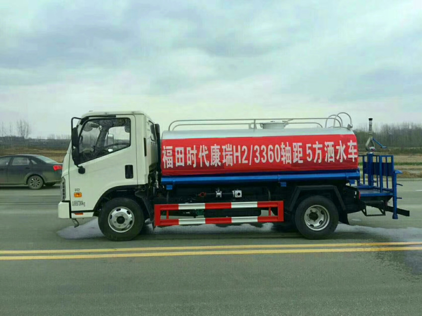 福田時代5噸灑水車,罐體實際容積5立方,凡是購買該車的用戶,灑水車廠家立送7天臨時牌照一份,灑水車的所有功能配件,均享有一年的質保期,質保期內免費更換,