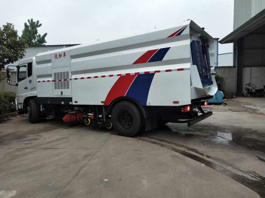 掃路車采用吸掃混合的方式收集垃圾,濕式除塵、電液控制,液壓傾翻卸料的作業方式對路面進行清掃作業。掃路車采用“中置四掃盤+噴霧降塵裝置+中心隔板+后置吸嘴”的結構布局,讓清掃過程中砂石不在飛濺揚塵,此布局便于清掃裝置與吸盤的調整與維護,轉場作業時整車通過性好。
