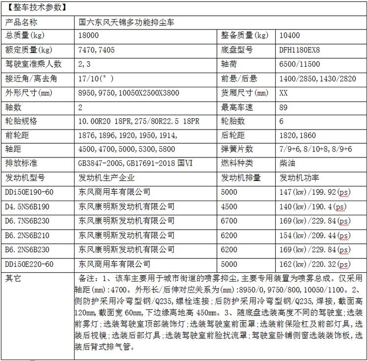 東風天錦霧炮抑塵車底盤配置: