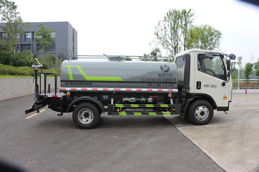 改裝配置:罐體有效容積為5立方灑水車,帶泵,罐體鋼板為4MM碳鋼,罐體及整車外形尺寸按照公告。整車前沖、后灑、側噴、帶65消防接口,后平臺帶泡不帶門,前封頭帶水位計,后平臺主管路帶1寸澆花接口,后爬梯。平臺后部帶小安全告知牌:“隨時停車,注意安全”,帶兩根水管及陰陽端。罐體顏色:上白色下東風蘭,罐體兩側噴“綠化噴灑車”,貼反光標示