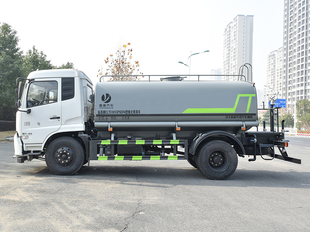 東風天錦 12 噸灑水車整車型號 CLT5161GPSDF6 型綠化噴灑車 2 發動機型號 DDi47E210-60 3 發動機馬力/功率 龍擎 210 馬力/154KW 4 發動機排量 4750ML 5 變速箱 法士特 8 檔(帶高低檔) 6 輪胎規格 9.00 鋼絲胎 7 軸距 3950 8 總質量 16200KG 9 整備質量 6300KG 10 額定載質量 9705KG 11 整車尺寸(長×寬×高) 7.8*2.5*3.2 12 罐體容積 12 方 13 燃料種類 柴油 14 排放標準 國六 15 水泵型號 60/90 16 罐體材質 Q235 碳鋼