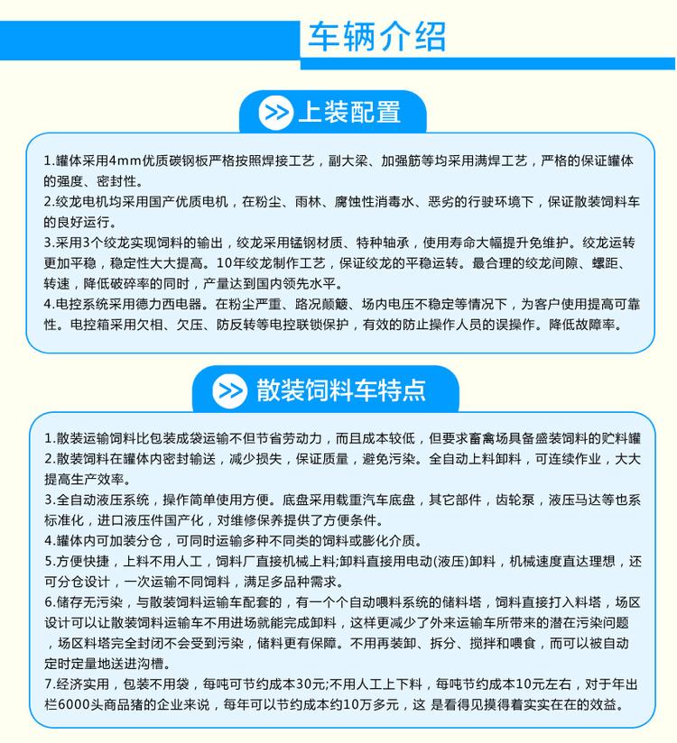 散裝飼料車有整車式和獨立罐式(可用相應載貨車運輸)等。按驅動形式分有:電動卸料散裝飼料車、全液壓卸料散裝飼料車。