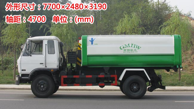 當軸距為4.5米時,可拉11~12方垃圾箱;軸距為4.7米時,可拉13~14方垃圾箱;軸距為5.1米時,可拉12~15方垃圾箱。勾臂為高強度一體式勾臂,國產液壓系統,雙杠液壓支撐,帶鎖緊裝置,可加裝后液壓支腿。