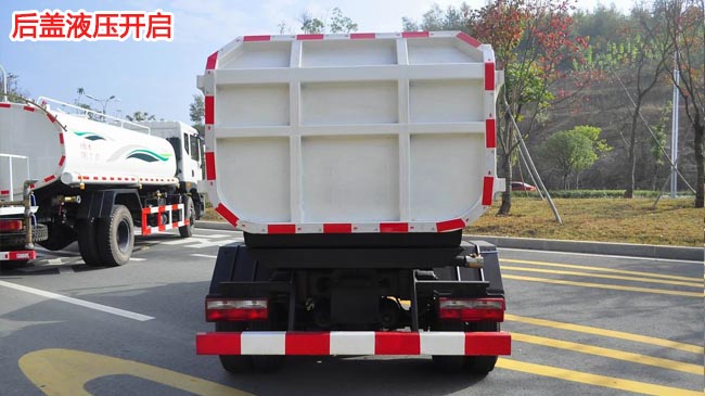 容積5~6立方米,箱體結構為墻板形式,碳鋼材質,厚度邊3底4,國產油泵、多路閥、取力器、油缸,駕駛室外部操作,操作箱帶手油門拉線,主臂油缸帶平衡罰,后門鎖緊為機械鎖緊,后門手動開啟。