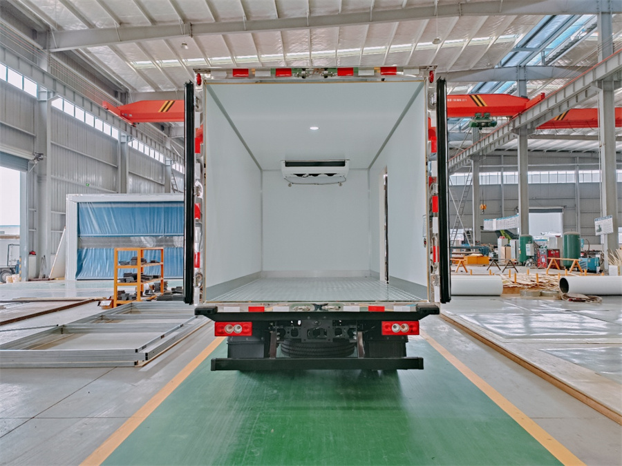 廂體采用內(nèi)外玻璃鋼材料制作,中間夾層為高密度保溫材料,用真空復合一次成型,表面光潔平整,強度高,使用壽命長,廂體邊緣采用優(yōu)質(zhì)鋁合金包邊和專用密封膠處理,具有重量輕、保溫、密封效果好等特點。門框鎖件為不銹鋼材質(zhì),門四周用一次成型密封條密封,廂體外形平整美觀,車廂頂部加以雨檐,避免下雨天雨水對車廂的浸泡,延長廂體使用壽命,車廂內(nèi)配有人性化照明系統(tǒng)。穩(wěn)固性和氣密性是普通冷藏車廂體不可比的,并且具有質(zhì)量輕,抗沖擊力強,無滲透等優(yōu)點。配備國產(chǎn)580制冷機組。