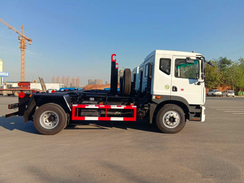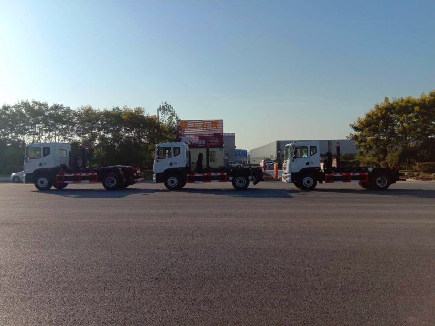 勾臂式垃圾車即車廂可卸式垃圾車、拉臂式垃圾車。該車廣泛適用與城市街道學校垃圾處理,可一車配備多個斗,各個垃圾點放置多個垃圾斗,帶自卸功能,液壓操作,方便傾倒。該車的箱體部分完全由液壓系統來控制,在平日里可將車載垃圾箱放置到各個垃圾收集站,待垃圾收集滿后,該車可直接開赴至垃圾站,通過液壓系統的操控,可將垃圾車后座上加裝的勾臂放下,掛住站內垃圾箱前端的連接點,將垃圾箱拉至車體的后座上,此時即可啟動車輛,將垃圾運送至垃圾處理站內,進行自卸式傾倒。該車最主要的優點就是可一車配多斗,一輛車就可以維持數個垃圾收集站的運轉,效率高,且箱體為密封式設計,不會造成二次污染。