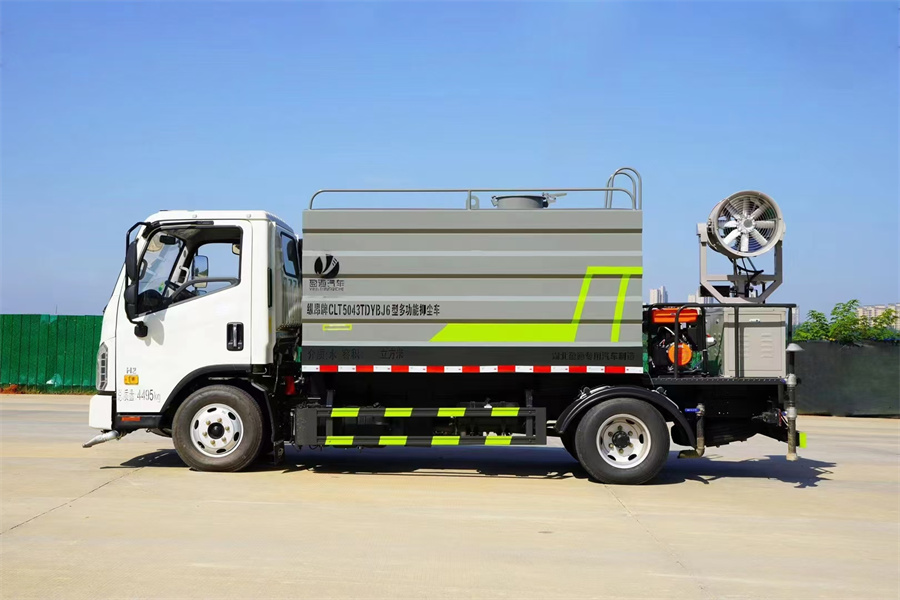 福田7方藍牌霧炮灑水車產品簡述:縱昂牌 CLT5043TDYBJ6 型多功能抑塵車標配前噴(鴨嘴)、后對 沖、后灑、側噴、后置式工作平臺,平臺上配置綠化水炮(可 360°旋轉,既可 以調成柱狀,也可以調成霧狀),配備優質大功率專用灑水泵(可自吸自排, 可從河里或池塘抽水到罐體),取力器,雜物過濾網,消防接口,自流球閥系統、 取力器、球閥、濾網均為國家標準產品,主管道加粗,法蘭墊、法蘭盤加厚, 大通徑球閥。整體具備性能優良安全可靠、效率高、流量大、維修方便等特點。