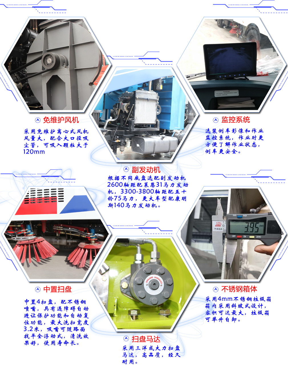 此車為道路洗掃專用車輛,專用裝置為掃刷.防護(hù)裝置均采用Q235A材質(zhì),均采用焊接連接, 專用裝置掃刷代替部分側(cè)面防護(hù),掃刷離地高為(mm):180,后下部防護(hù)與車架焊接連接, 后下部防護(hù)尺寸:50×150(mm),離地面高度420mm. ABS系統(tǒng)型號(hào)為XH-KQ4S4M-E01, 生產(chǎn)企業(yè)為廣州市西合汽車電子裝備有限公司;型號(hào)為CM4XL-4S/4M, 生產(chǎn)企業(yè)為廣州瑞立科密汽車電子股份有限公司.整車長(zhǎng)/軸距對(duì)應(yīng)關(guān)系為(mm):7590/4200,7890/4500, 8090/4700,8590/5200,8990/5600,4700/8310,5200/8680.選裝不同的外觀圖片.隨底盤(pán)選裝駕駛室. |