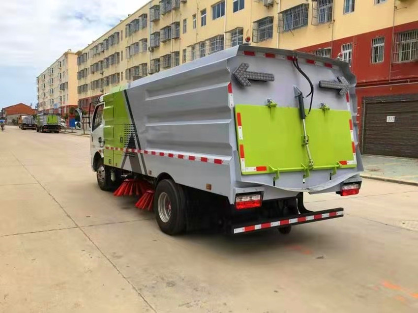 1、東風多利卡掃路車采用吸掃混合的方式收集垃圾,濕式除塵,電液傾翻卸料的作業方式對路面進行清掃作業。