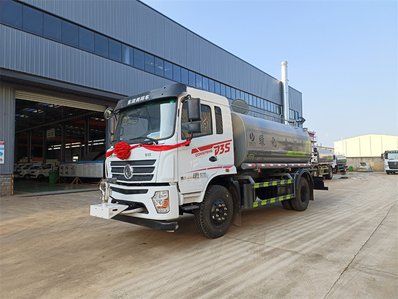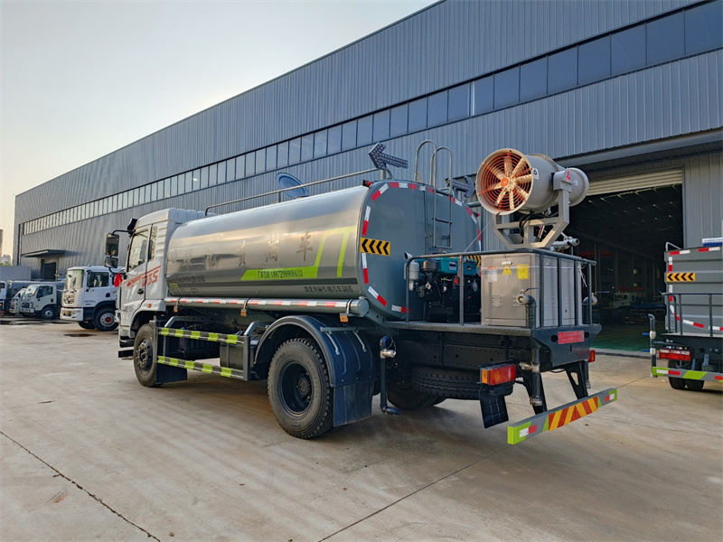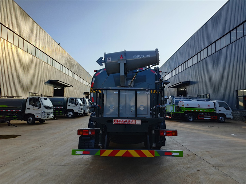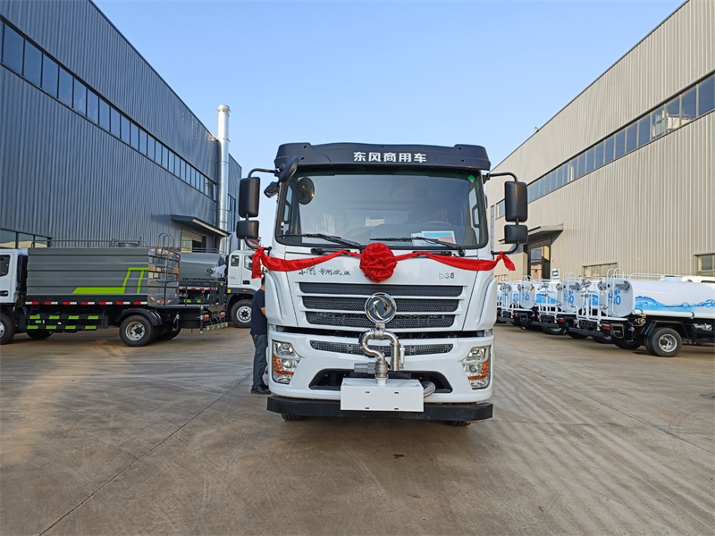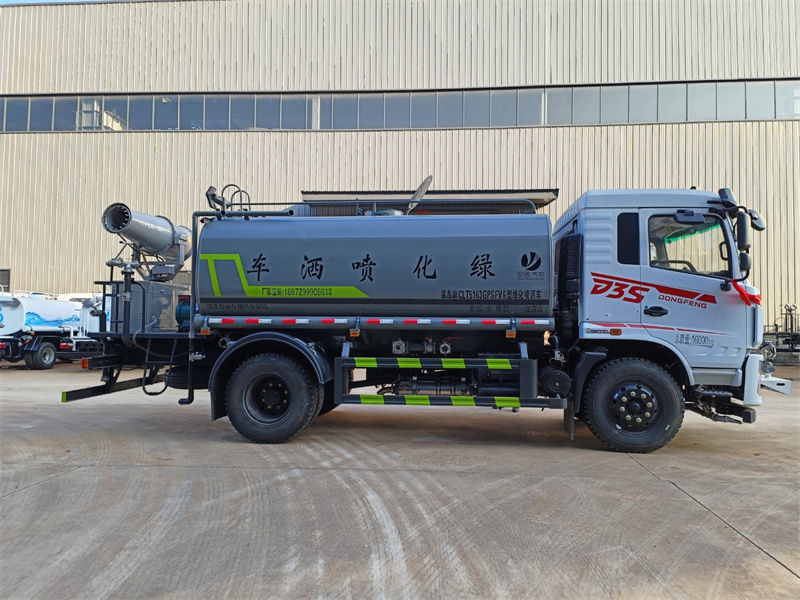 東風12噸霧炮灑水車產品標配前噴(鴨嘴)、后沖、后灑、側噴、后置式工作 平臺,平臺上配置綠化水炮(可 360°旋轉,既可以調成柱狀,也可 以調成霧狀,更可以調成直沖狀、大雨、中雨、小雨、毛毛雨),配 備優質大功率專用灑水泵(可自吸自排,可從河里或池塘抽水到罐體), 取力器,雜物過濾網,消防接口,自流球閥系統、取力器、球閥、濾網 均為國家標準產品,主管道加粗,法蘭墊、法蘭盤加厚,大通徑球閥。 整體具備性能優良安全可靠、效率高、流量大、維修方便等特點