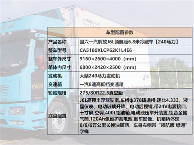 解放J6L 6米8冷藏車車身配置為:J6L精英版全浮高頂排半駕駛室,顏色為粉綠色(可選紅色,白色),液晶儀表、電動(dòng)玻璃升降、電動(dòng)后視鏡、側(cè)圍網(wǎng)兜、后圍窗簾導(dǎo)軌、全景窗簾導(dǎo)軌、頭頂放物盒、駕駛員座椅為真皮通風(fēng)空氣座椅(腰托、扶手)、中間座椅、帶24V電源接口、十寸屏、多功能大角度方向盤(pán) 自動(dòng)空調(diào)、前下防護(hù)裝置、400L鋁油箱、一體式金屬寬體保險(xiǎn)杠、駕駛室四點(diǎn)螺簧懸置、電動(dòng)液壓舉升裝置、鋁合金儲(chǔ)氣筒、120AH免維護(hù)蓄電池、LED轉(zhuǎn)向燈、霧燈帶輔助遠(yuǎn)光、懸架7/7+3、水壺座、定速巡航、VOSS管路及接頭、機(jī)箱橋體現(xiàn)6/6/6萬(wàn)公里長(zhǎng)換油周期、右轉(zhuǎn)彎音響提示、限速89km/h、T-box1.5、安全帶佩戴提醒、制動(dòng)器襯片更換報(bào)警、金色鷹標(biāo)、車身左側(cè)帶“精英版”字樣、排氣節(jié)流閥,大柴CA6DH1-24E6,240馬力發(fā)動(dòng)機(jī),(EGR+DOC+DPF+SCR氣驅(qū)),ф395離合器,變速箱CA8TAX090M變速器,車橋ф378鑄造橋(自動(dòng)調(diào)整臂、國(guó)產(chǎn)ABS、1860輪距) 9T橋,4.333,車架:237×75×6.5,275/80R22.5型18層級(jí)無(wú)內(nèi)胎(土樓輪輞、國(guó)內(nèi)一線品牌)。