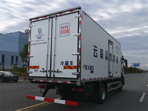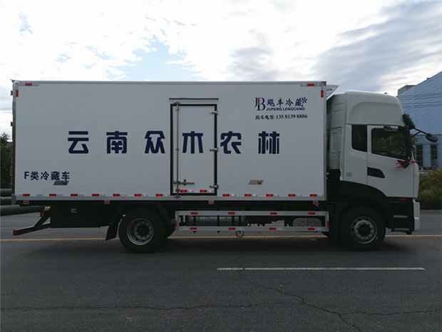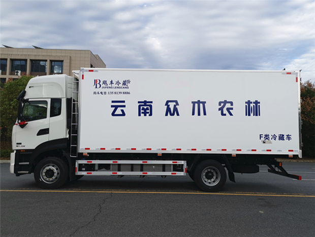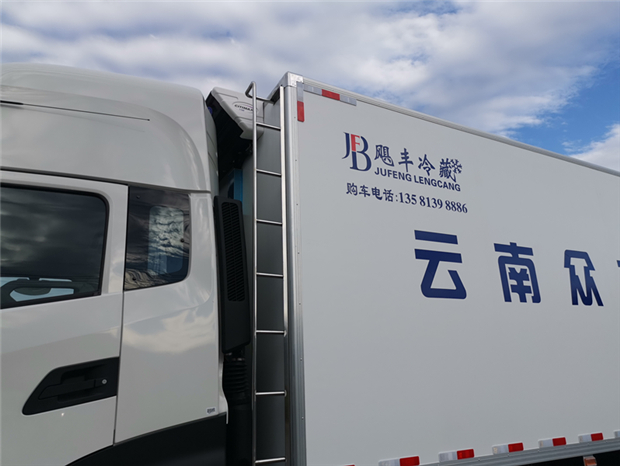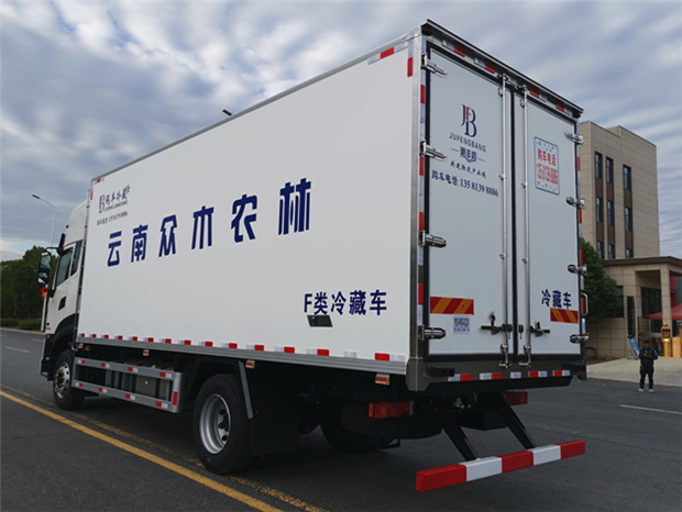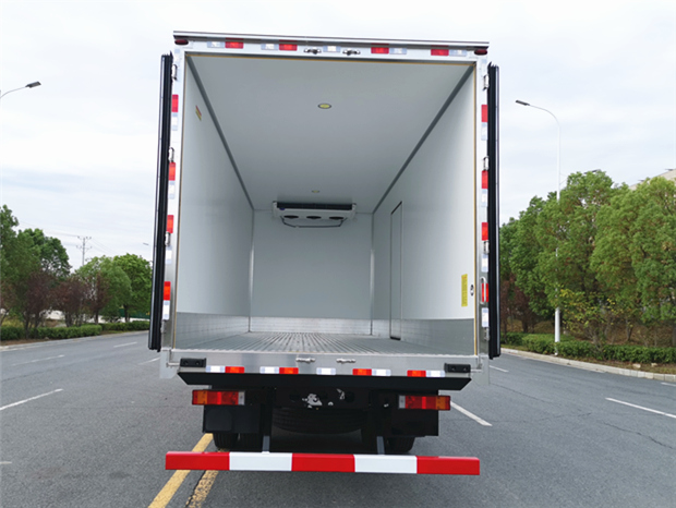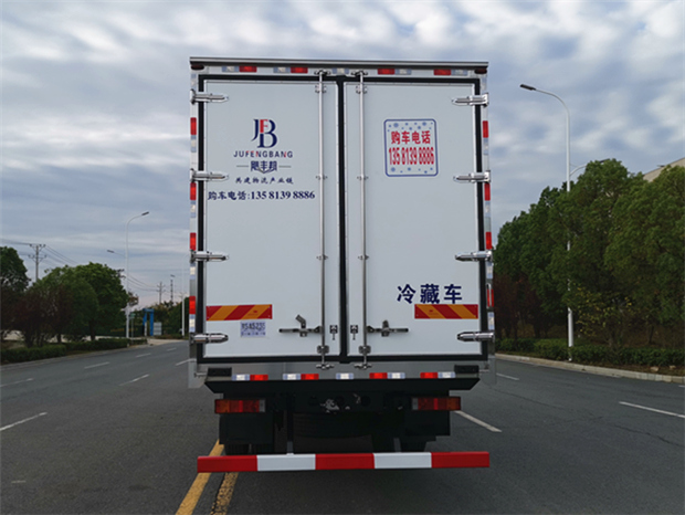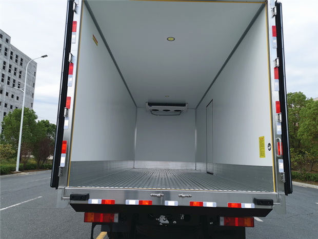 車廂配置為:《斷橋隔溫工藝、整體結構框架》;內(nèi)外面料為3mm新款玻璃鋼;側(cè)板+頂板:全密封雙組合聚氨酯膠粘連;廂體厚度為8cm;頂板10cm厚,底板12cm厚,最新款鋁合金包邊型材;型材局部厚度為4mm(鋼制鉚釘加固);廂體內(nèi)部采用2個LED照明燈及廂體示寬燈;后門框為3mm厚不銹鋼材質(zhì);門框密封條為三元乙丙橡膠材質(zhì);加厚型不銹鋼合頁及鎖件;副梁為Q700車用大梁鋼;15mm厚大梁墊皮;加裝防撞膠塊;不銹鋼門鎖件,配后雙開門。底板為加厚鋁合金通風槽滿焊,帶30cm高新型圍裙,副駕駛一側(cè)居中靠前開單側(cè)門,鋁合金側(cè)防護,不銹鋼冷機維護爬梯,帶大工具箱一個。帶剎車淋水器,前后淋水分別控制。